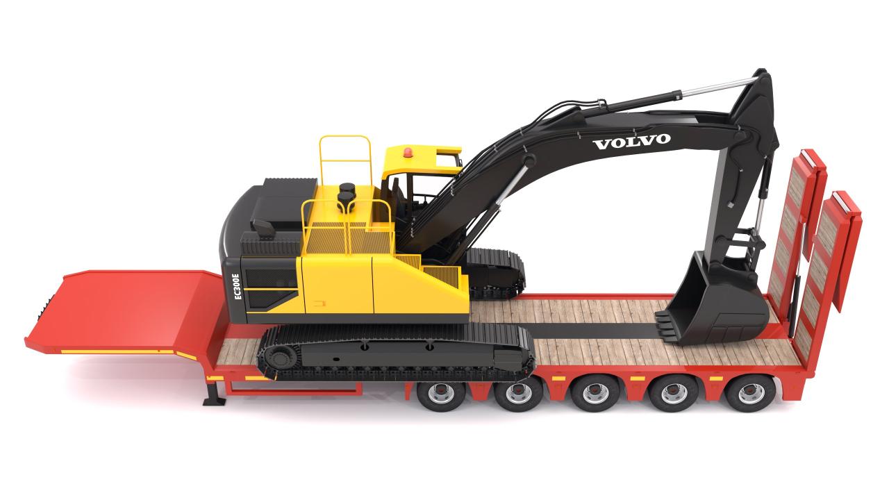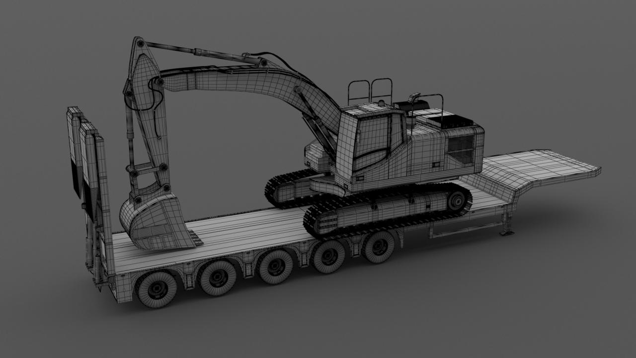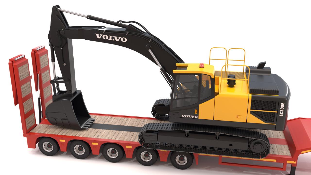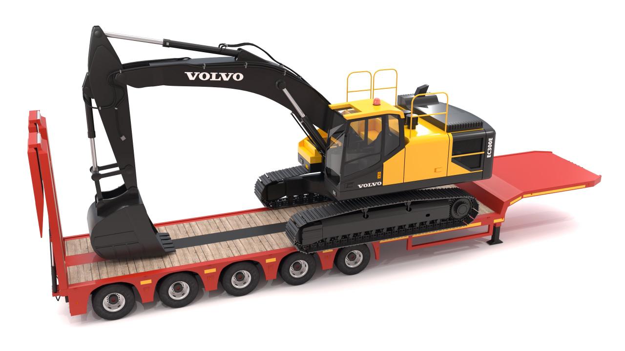 High detailed Lowboy Trailer with Excavator Volvo EC300E. Included: 55 Materials 11 Textures - The model is delivered with all its parts in a static position.